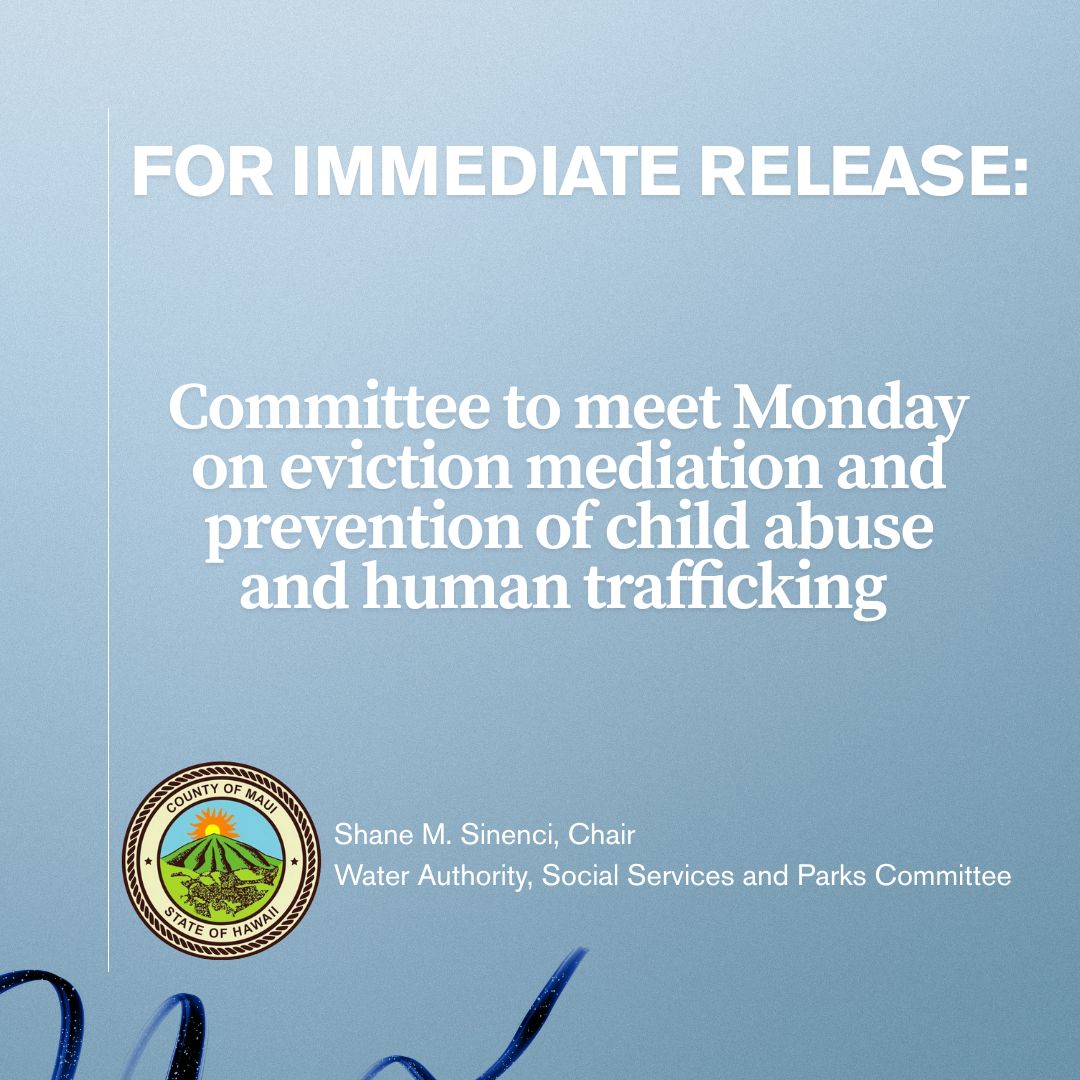 For Immediate Release: Press Release by: Shane M. Sinenci, Chair Water Authority, Social Services and Parks Committee media@mauicounty.us Committee to meet Monday on eviction mediation and prevention of child abuse and human trafficking WAILUKU, Hawaiʻi (Jan. 22, 2026)—The Water Authority, Social Services and Parks Committee will meet at 9 a.m. Monday to receive an update […]
