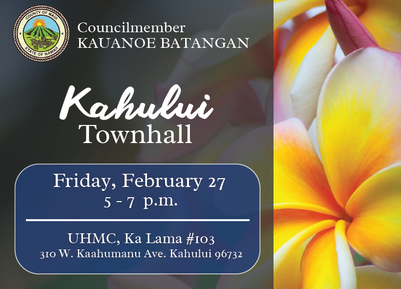 For Immediate Release: Press release by: Thomas Cook, Councilmember Maui County Council media@mauicounty.us South Maui community townhall on council budget priorities to be held Feb. 24 KĪHEI, Hawaiʻi (Feb. 10, 2026)—Councilmember Tom Cook announced today he will host a South Maui community townhall on Feb. 24 at 6 p.m. at the Malcolm Center to gather […]