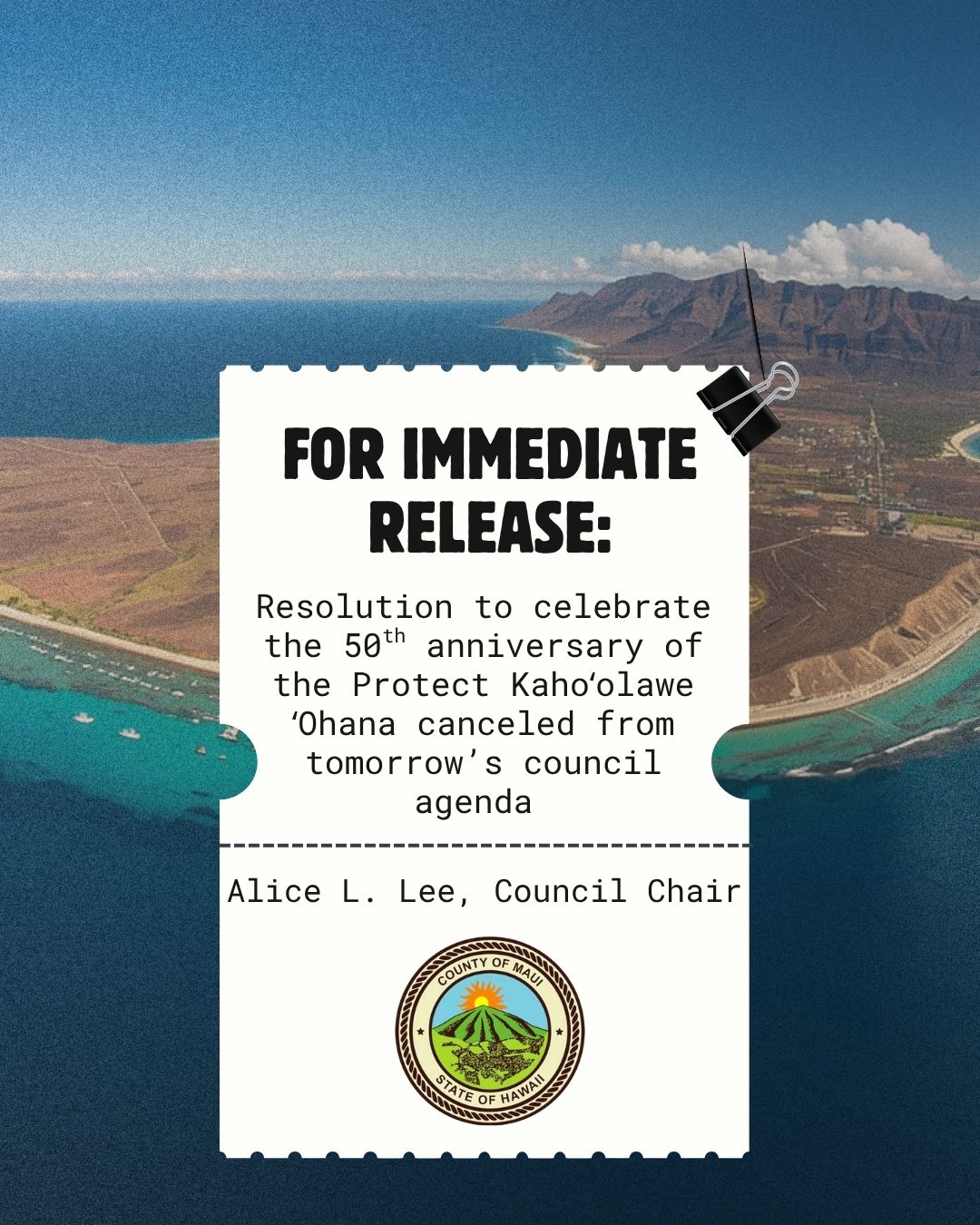 For Immediate Release: April 1, 2026 Press Release by: Alice L. Lee, Chair Maui County Council media@mauicounty.us Resolution to celebrate the 50th anniversary of the Protect Kaho‘olawe ‘Ohana canceled from tomorrow’s council agenda WAILUKU, Hawaiʻi (April 1, 2026)—Resolution 26-50 was canceled from tomorrow’s council meeting agenda and will be rescheduled at the council’s April 17 […]