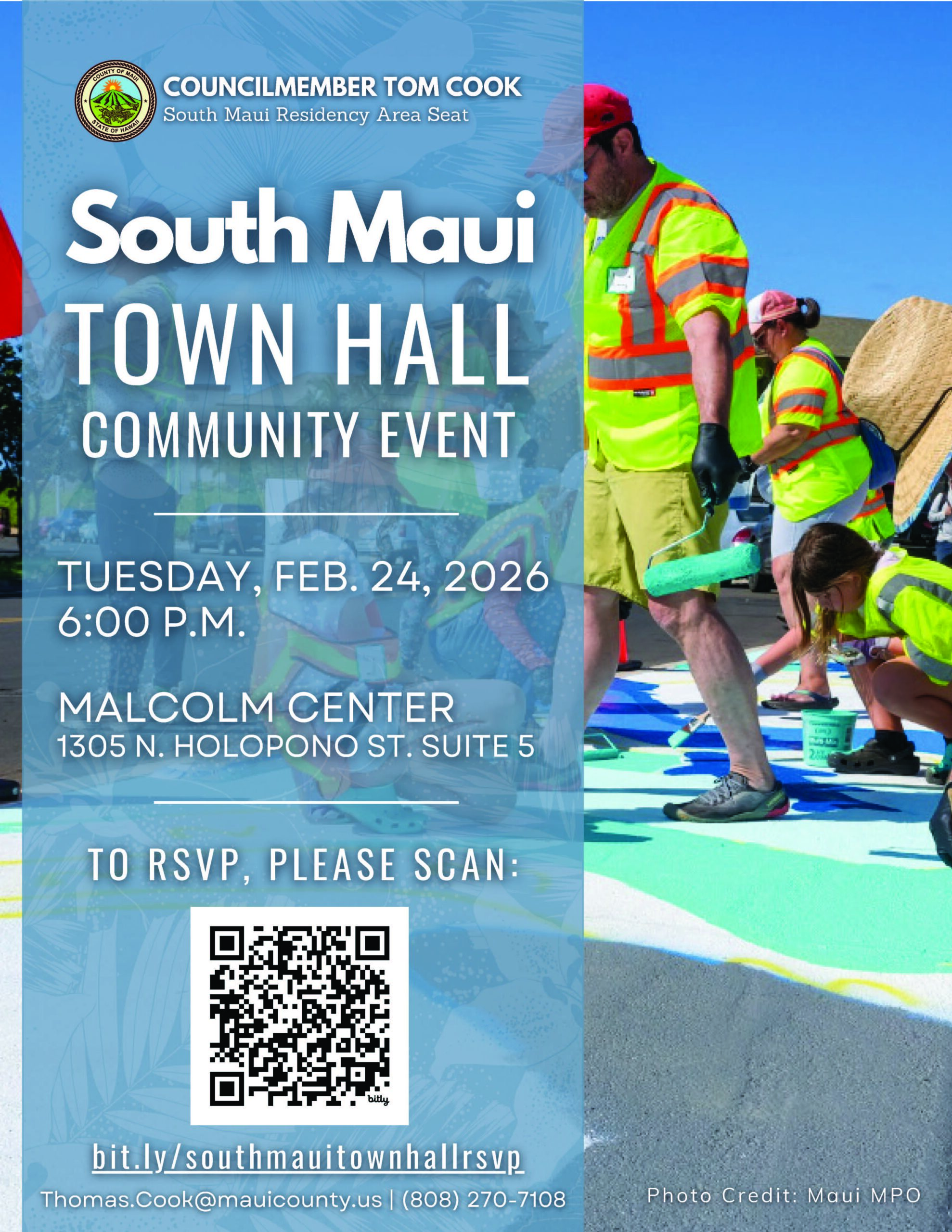 To assist with headcount, residents who plan to attend the townhall are encouraged to RSVP online at bit.ly/southmauitownhallrsvp though RSVPs are not required.